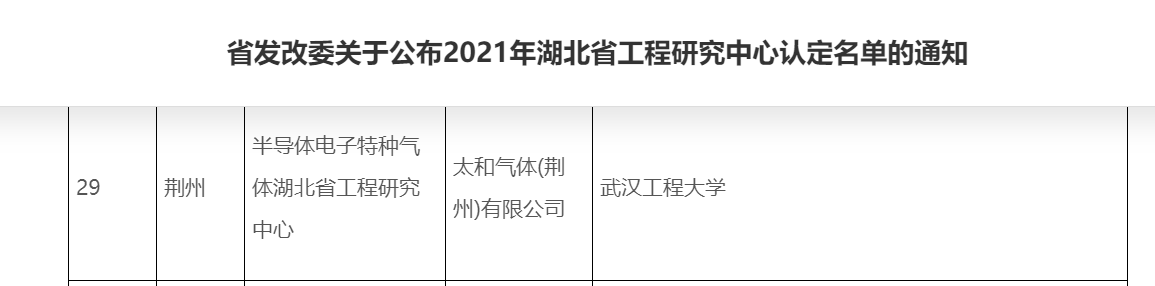 2021年12月,省發(fā)改委公布了2021年湖北省工程研究中心的認(rèn)定企業(yè)名單,太和氣體牽頭創(chuàng)建的“半導(dǎo)體電子特種氣體湖北省工程研究中心”上榜。